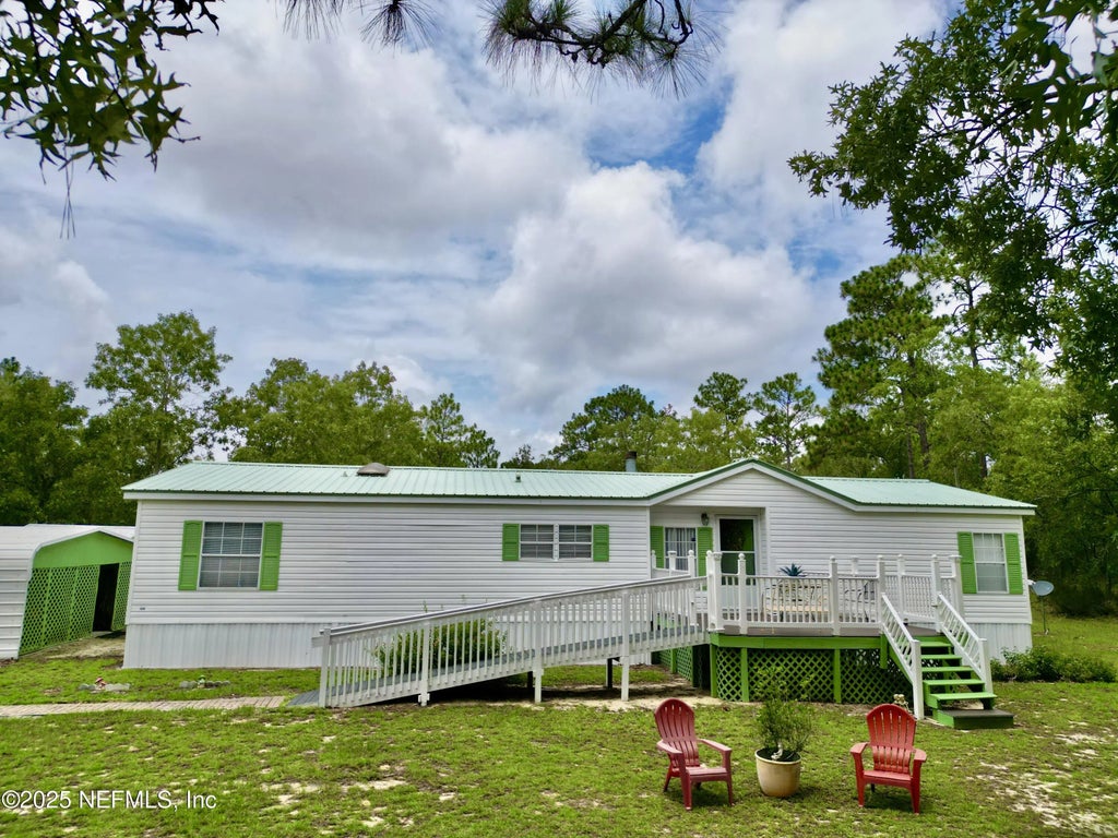 HOME WITH FIVE ACRES ON PRIVATE AIRPORT AT MELROSE LANDING WITH PAVED RUNWAY NEAR HISTORIC MELROSE FLORIDA. The private airport features 3200' lighted paved runway with a 1200' sod-over, and a member community center. This spacious 3/2 1719 SqFt HOMES of MERIT is move in ready. The split open floor plan is wheel chair accessible with over sized doors, and has a new composite deck with Handicap Ramp. Other features include: metal roof, new AC System, fireplace, a roomy practical kitchen with separate dining area, laundry room, 2 car carport and large storage building. ALSO, this home may could come furnished! The 5 acres is partially cleared and has a tie down area for plane and 259 feet fronting the Taxi Way. So whether you fly, have big hobbies needing lots of room or just wanting some good ole rural country living, then this is the place it could all happen for you. In Melrose you'll find only one traffic light but this friendly little town has restaurants, grocery stores, shopping lots of live music, Senior Center, doctors, farmers market, library, art shops, music store and our beautiful pristine 6000 acre Santa Fe Lake for all your recreational pleasures, swimming, wake surfing, kayaking, skiing, sailing and more. This location is also an easy commute to Gainesville, Palatka, Starke and Ocala Florida. Fly in or drive over to see what a different way of life it is out here in Rural America. For more airport and local information search Melrose Landing Hawthorne Florida and Historic Melrose. Note: Photos include some around town pictures