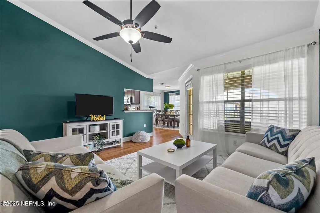 FULLY FURNISHED. Meticulously maintained 3rd floor condo located near St Johns Town Center with modern furniture and luxury finishes. This quiet corner unit features beautiful green decor with plenty of natural light, bamboo floors, soaring ceilings, and a spacious private balcony overlooks green space and lake. The condo includes two large bedrooms and two bathrooms, and features modern kitchen with stainless steel appliances, dining room, in-unit washer/dryer and lots of closet space. The split floorplan is perfect for privacy with centralized living area. Enjoy resort living in a peaceful oasis with pool, gym, basketball court, and car wash within a secure gated community. Community is centrally located with easy commute to beaches, downtown, Mayo Clinic, and is close to shopping, restaurants, and entertainment.