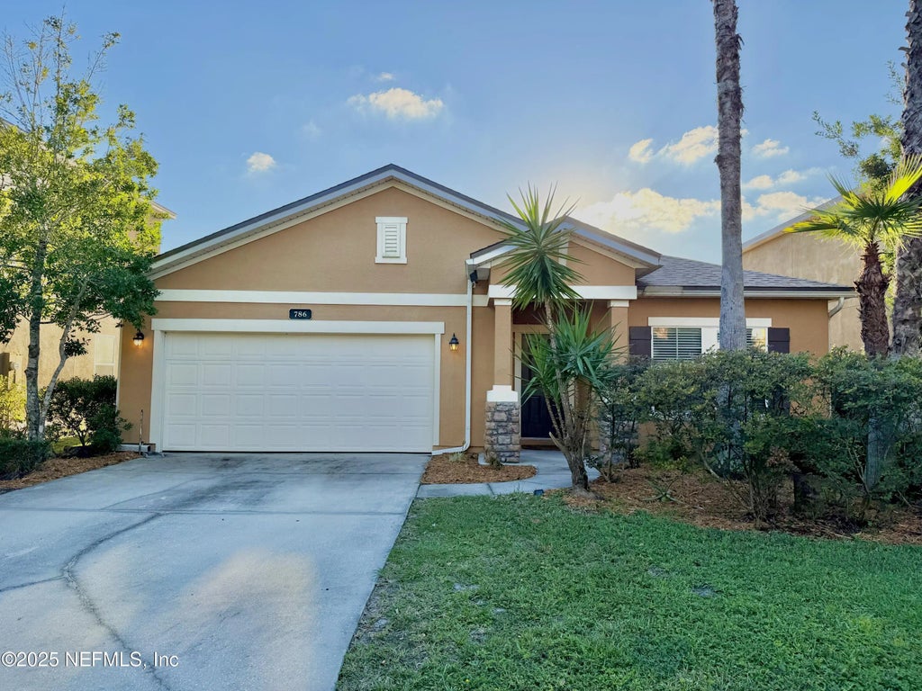 Move in today to this beautiful 4-bedroom, 2-bathroom home located on a pond in the desirable Whitfield neighborhood of Oakleaf Plantation. Inside, you'll find an office/flex space with hardwood floors, a spacious kitchen featuring granite countertops, stainless steel appliances, and a large island with bar seating. The family room also boasts hardwood floors and opens through sliding doors to a covered porch overlooking the pond and a fully fenced backyard. The large primary suite offers a walk-in closet and an ensuite bath with dual vanities, a soaking tub, and a separate shower.
