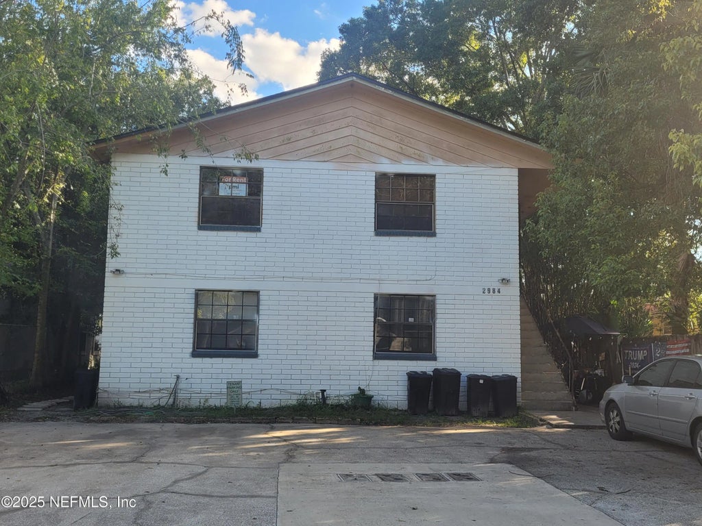This second-floor unit features a spacious family room complete with built-in shelving. The kitchen comes equipped with a refrigerator, stove, and a countertop microwave (as-is). It has been recently refreshed with new paint, ceiling fans, mini blinds, a linen closet, and wood plank-style laminate flooring